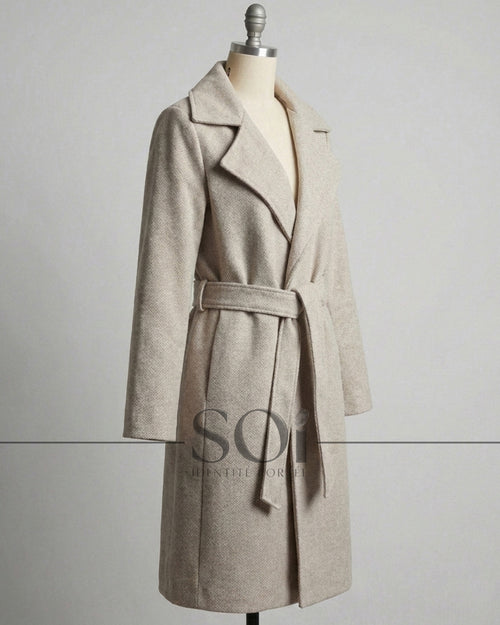 A mid-length tailored coat with a self-tie belt